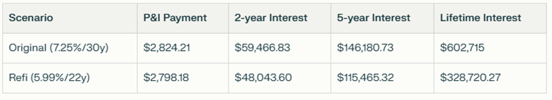 But here’s the real magic. What if you kept your payment about the same, but shortened your loan term? If you did a 22 year refinance at 5.99% for a $410,000 loan, your monthly payment would stay close to $2,798.