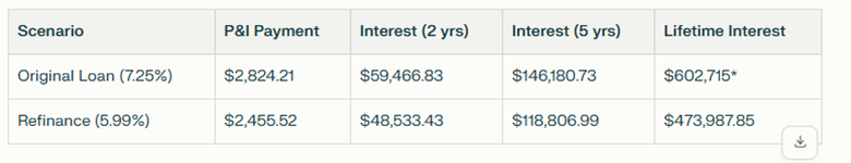 If you refinanced at 5.99% percent, you would drop your monthly payment by about $369, and save more than $128,000 in interest over the life of your loan. In just the first five years, you would save over $27,000 compared to sticking with the original loan.